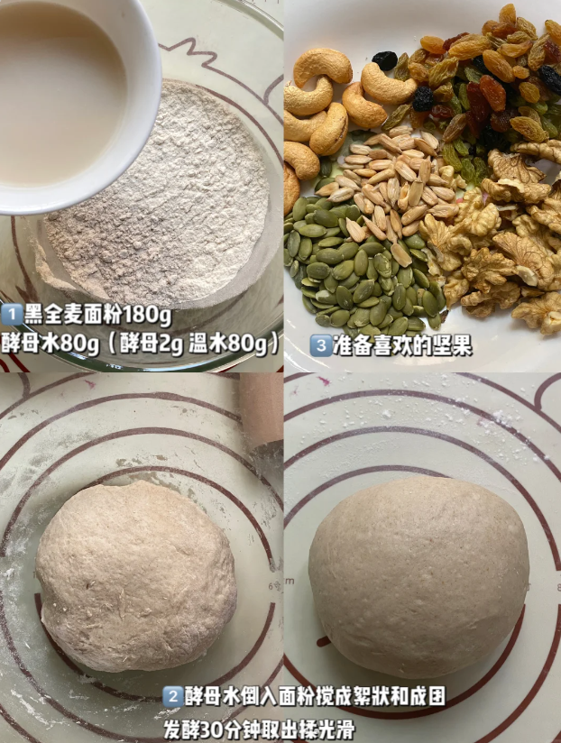 1.Pour the yeast water into the flour and stir to form a floc, knead into a ball then ferment for 30 minutes.