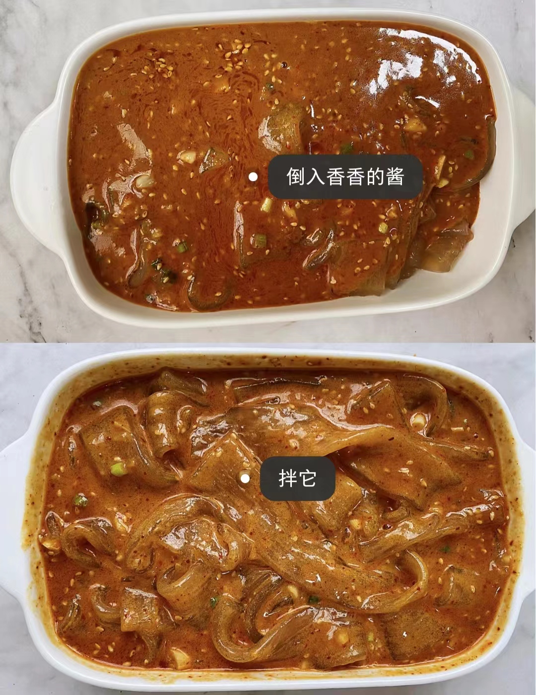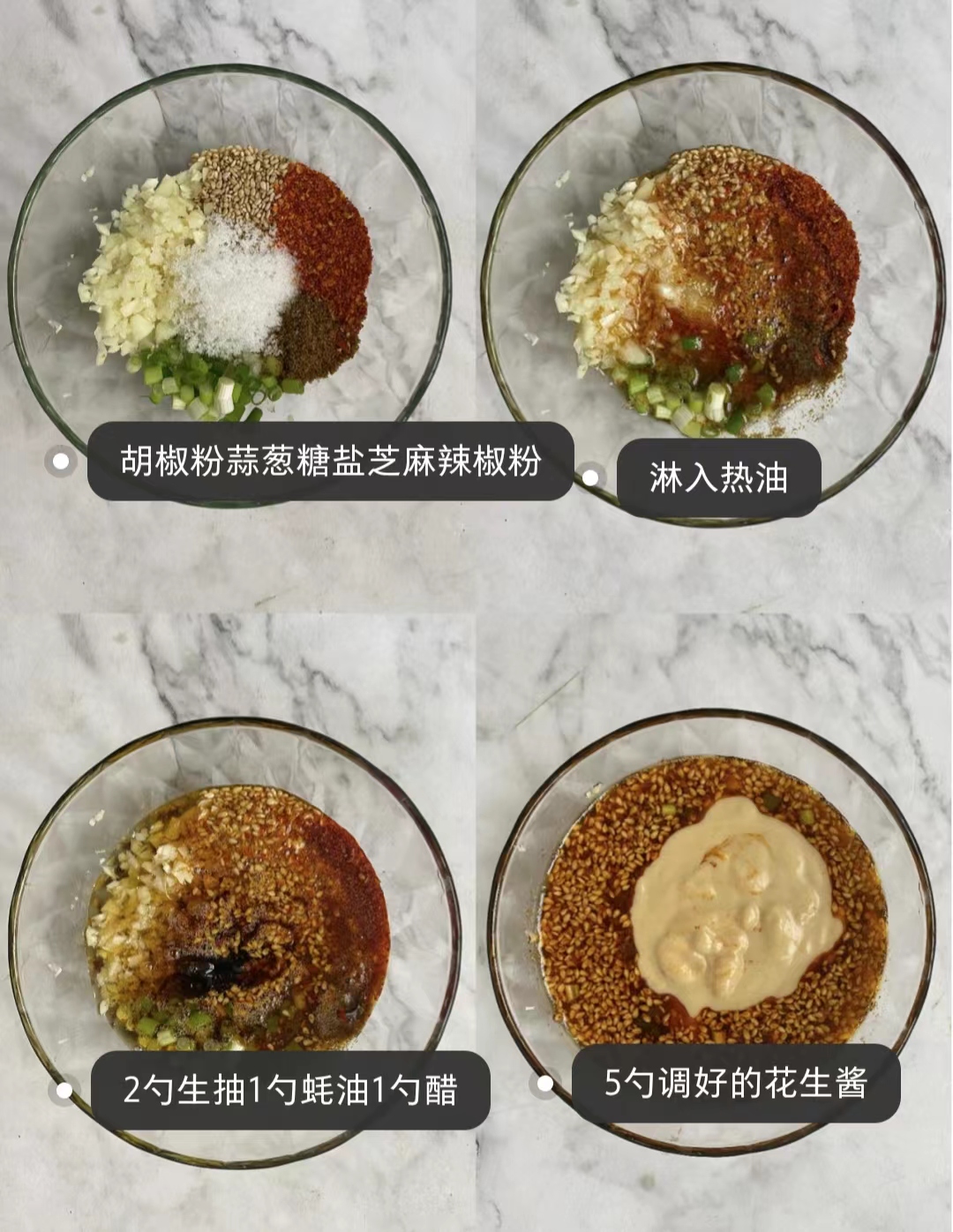 Mixing the chilli powder, minced garlic, sesame seeds, pepper, spring onion, sugar (a spoonful each) and a pinch of salt then pour over the hot oil.