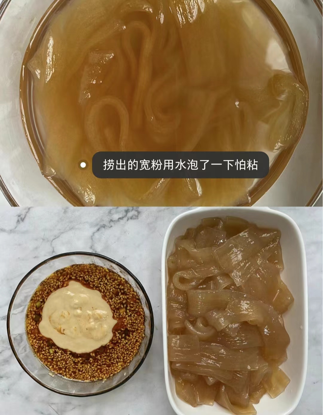 If the wide potato noodle is cooked first but the dressing is not yet sorted, you can continue to soak the wide potato noodle in the water first, otherwise it will stick together.